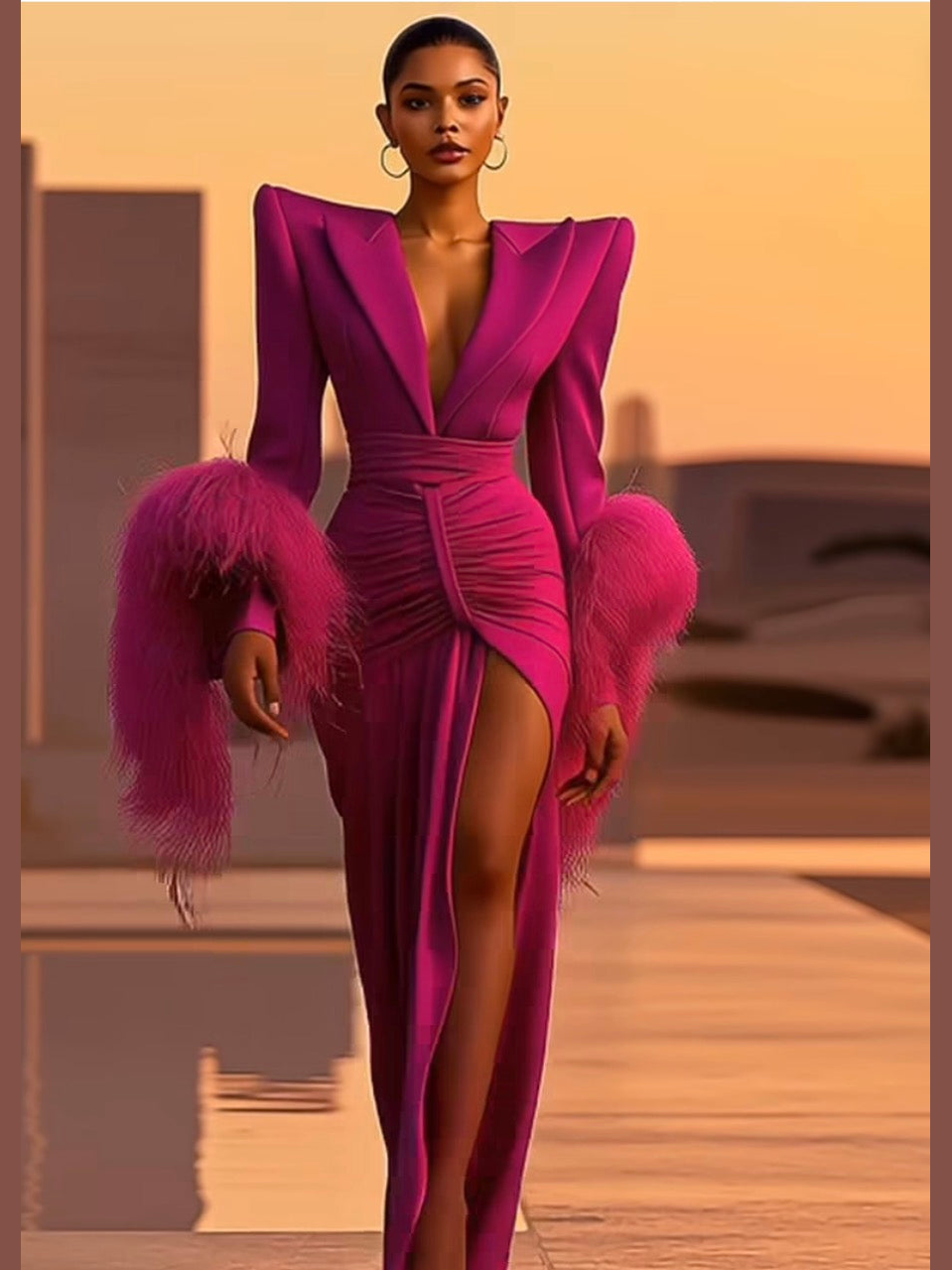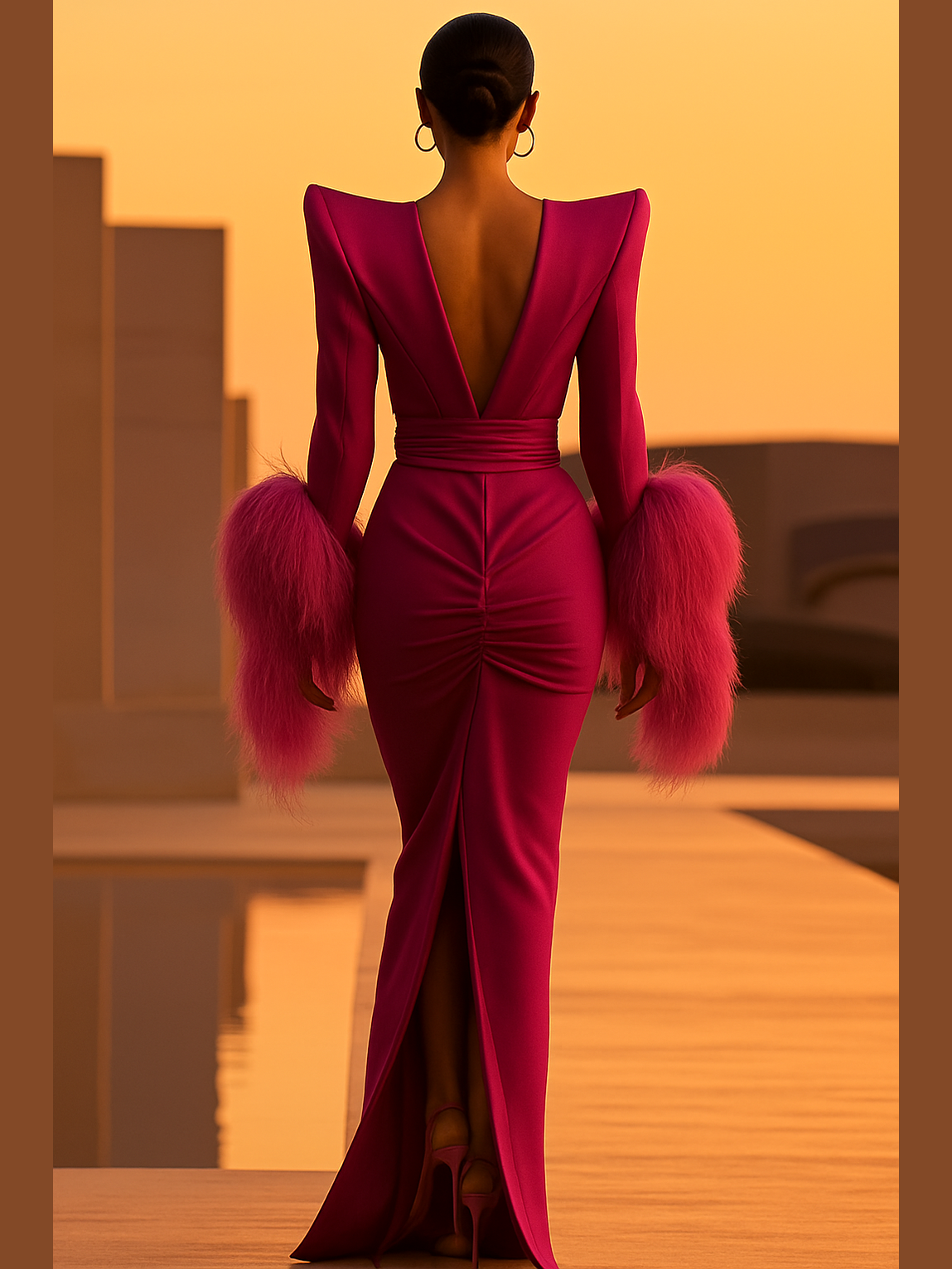 Step into your era of influence with Architect of Power — a sculpted masterpiece designed for the woman who leads effortlessly and leaves silence in her wake. This statement gown fuses bold structure with unapologetic glamour, featuring exaggerated couture shoulders, dramatic feather-trimmed sleeves, and precision ruching that carves the silhouette to perfection.