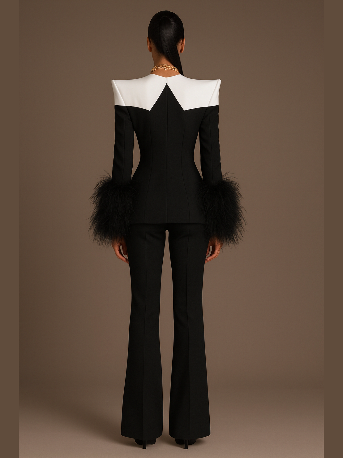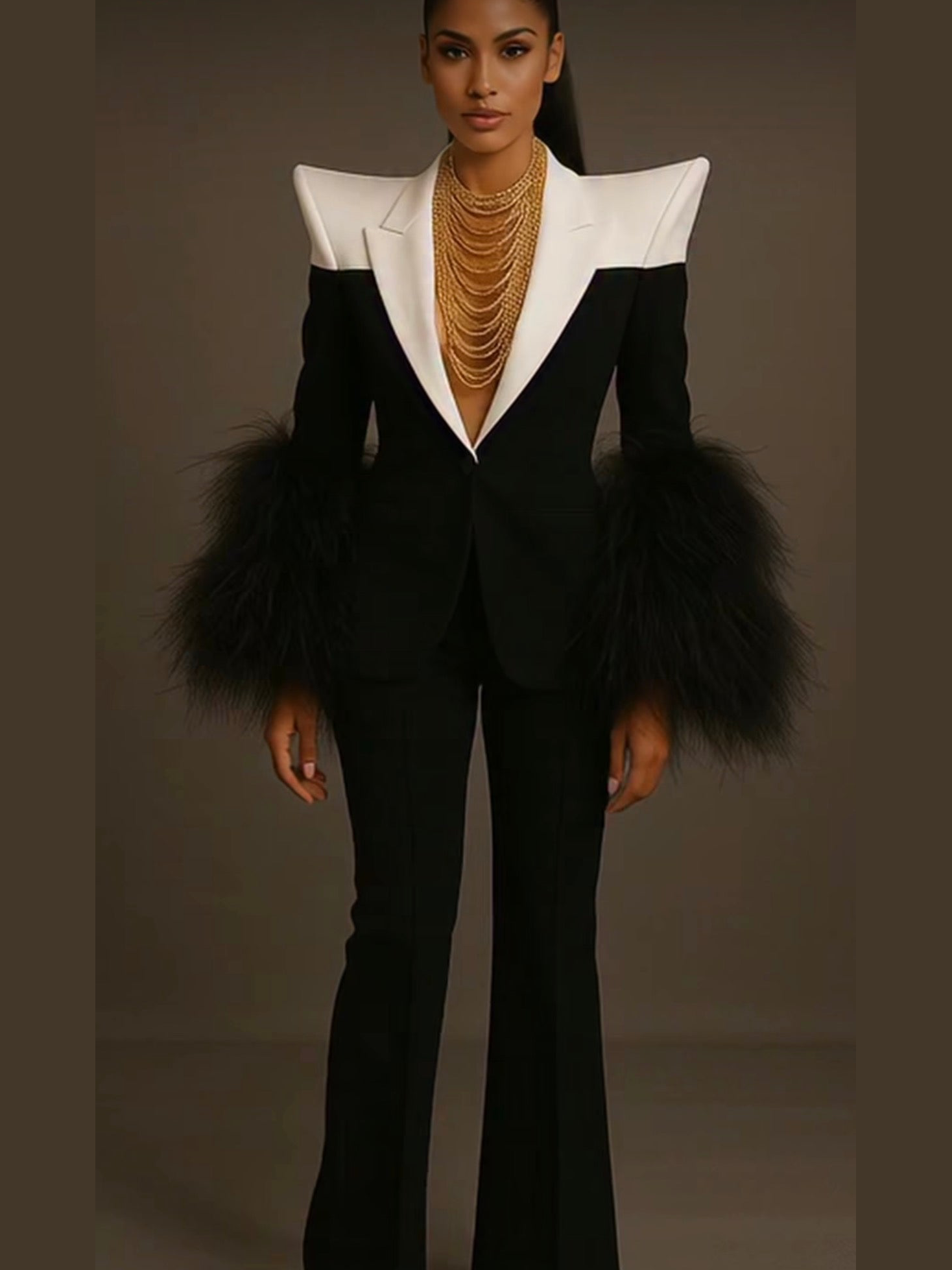 Paired with sleek, tailored flare pants that elongate the body, this set is the definition of luxury authority.