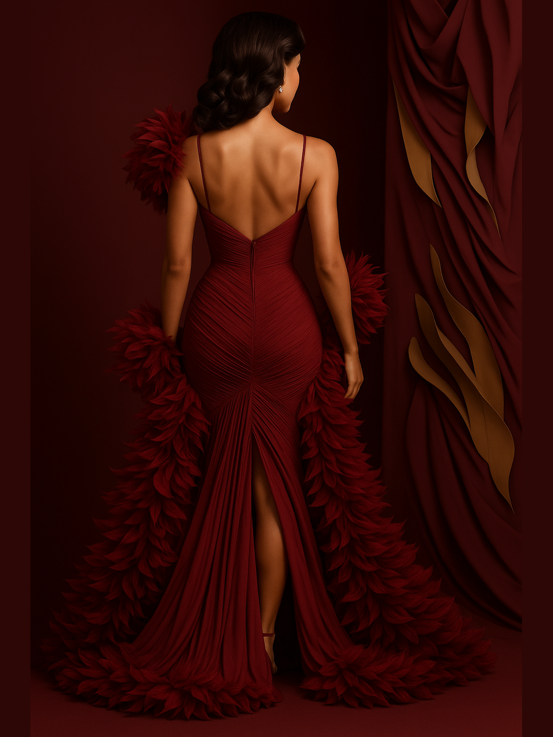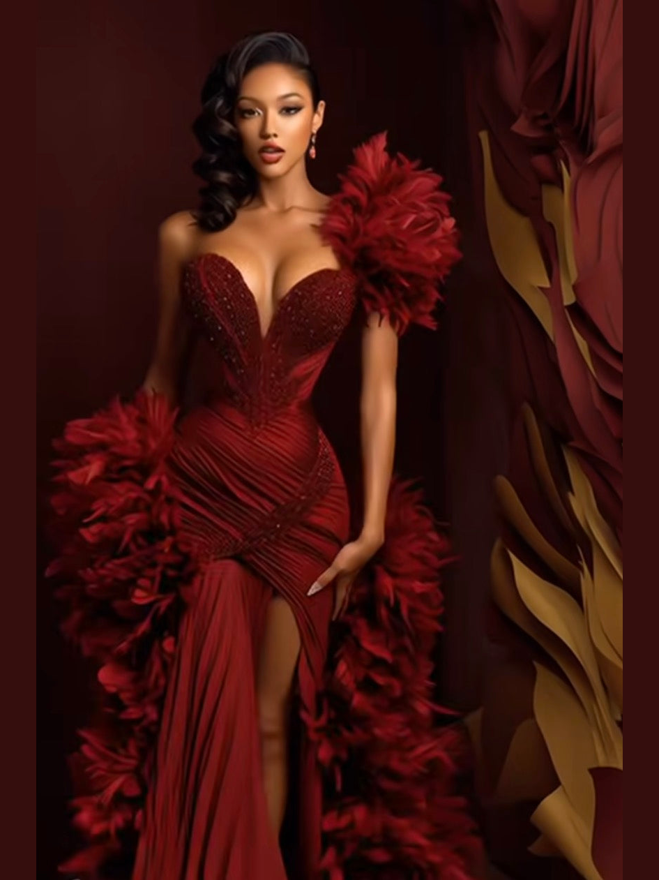 A sculpted, embellished corset cinches the waist and shapes the silhouette with unmistakable couture precision. One shoulder erupts in a cloud of luxe feathers, balanced by a cascading feather trim that trails with every step — a perfect blend of softness and spectacle.