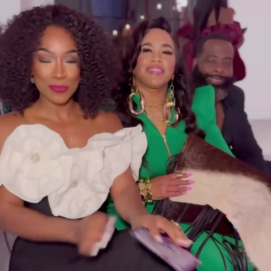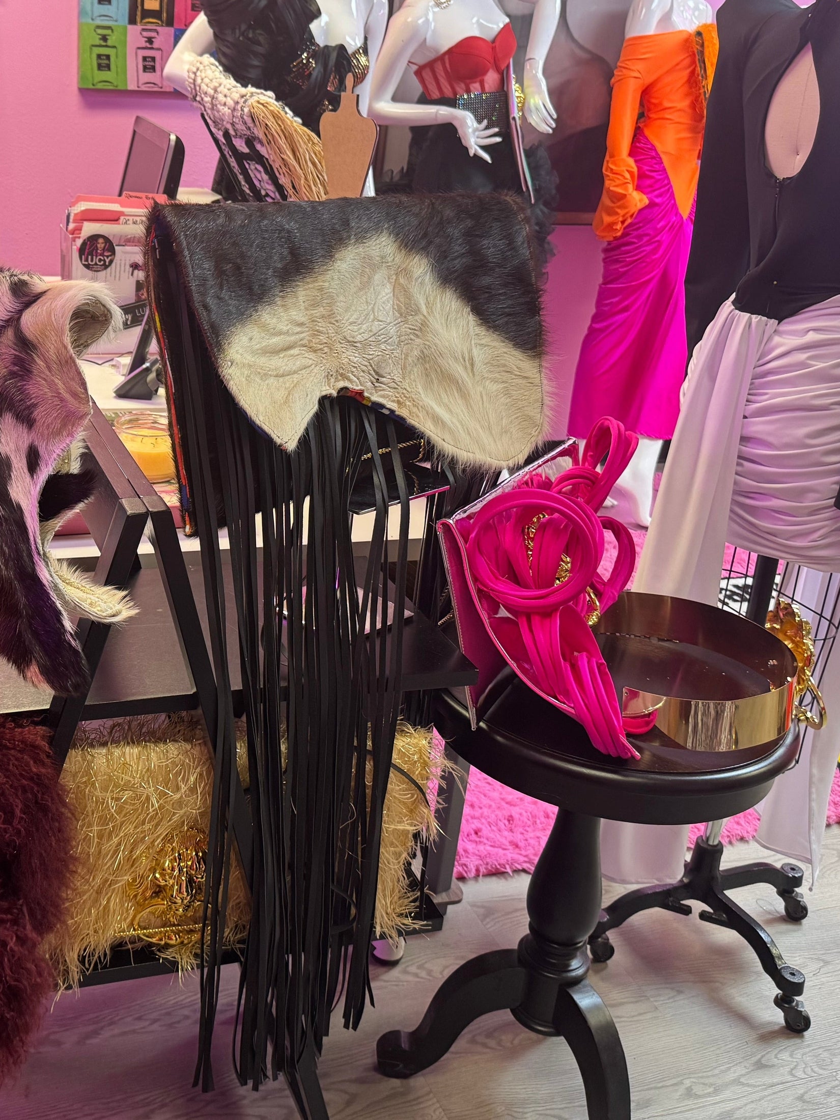 The Raw Edge bag is the perfect fusion of street couture and unapologetic luxury — crafted from authentic upcycled Levi’s (logo isn’t visible in product pics) denim and drenched in radiant gold chains. Each piece features hand-distressed fringe and a bold pop of chartreuse satin tucked into the pocket, giving it that signature PINK LUCY edge.