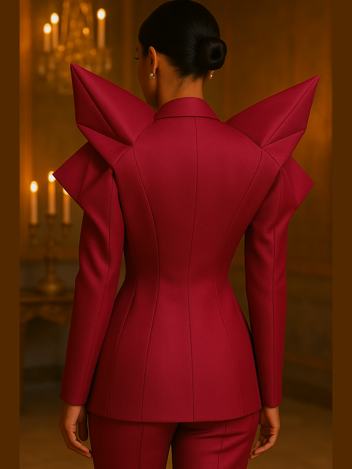 This look features our signature exaggerated couture shoulders, folded and engineered into sharp, geometric peaks that command attention from every angle. The plunging neckline adds a seductive undercurrent, perfectly balanced by the precision-tailored silhouette that cinches the waist and elongates the frame. Crafted in a rich, intoxicating fuchsia-crimson hue, this ensemble radiates luxury, dominance, and pure feminine force.