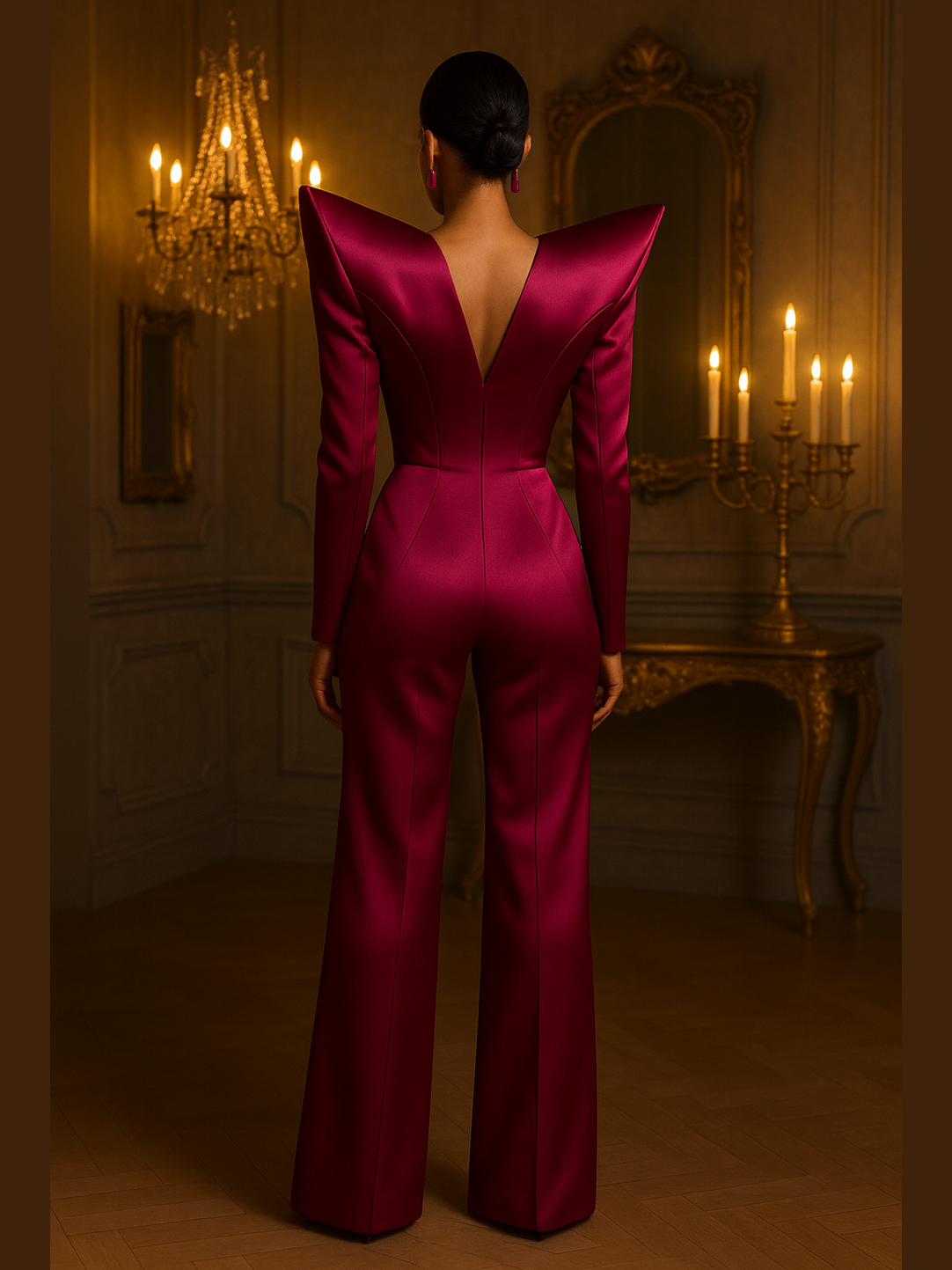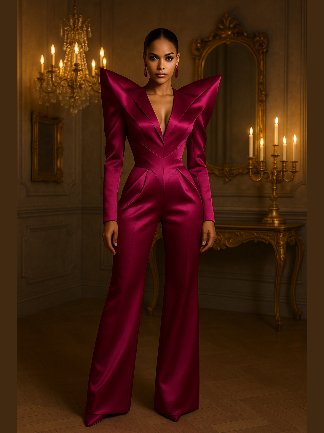 Bold, sculpted, and unmistakably commanding — Fierce and Fatal is for the woman who enters the room and instantly becomes the standard. Crafted from luxurious stretch satin, this jumpsuit delivers razor-sharp tailoring and a liquid sheen that moves like silk but holds shape like steel. The exaggerated peak shoulders and contoured waist create a lethal, fashion-forward silhouette that radiates dominance and unapologetic femininity.