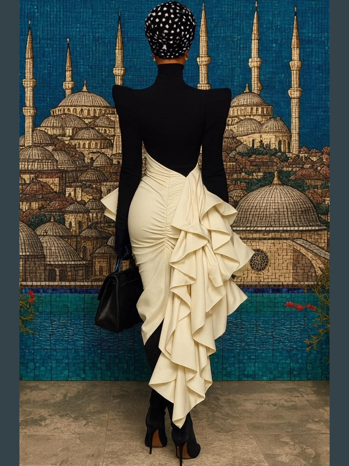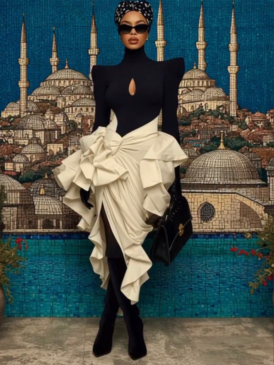 This sculpted black bodysuit features couture-sharp power shoulders and a sleek keyhole detail that frames the décolletage with refined confidence. The drama unfolds with an extravagant ivory draped skirt—artfully layered with voluminous ruffles that cascade like architecture in motion. This ensemble is a masterclass in cultural sophistication and modern royalty.