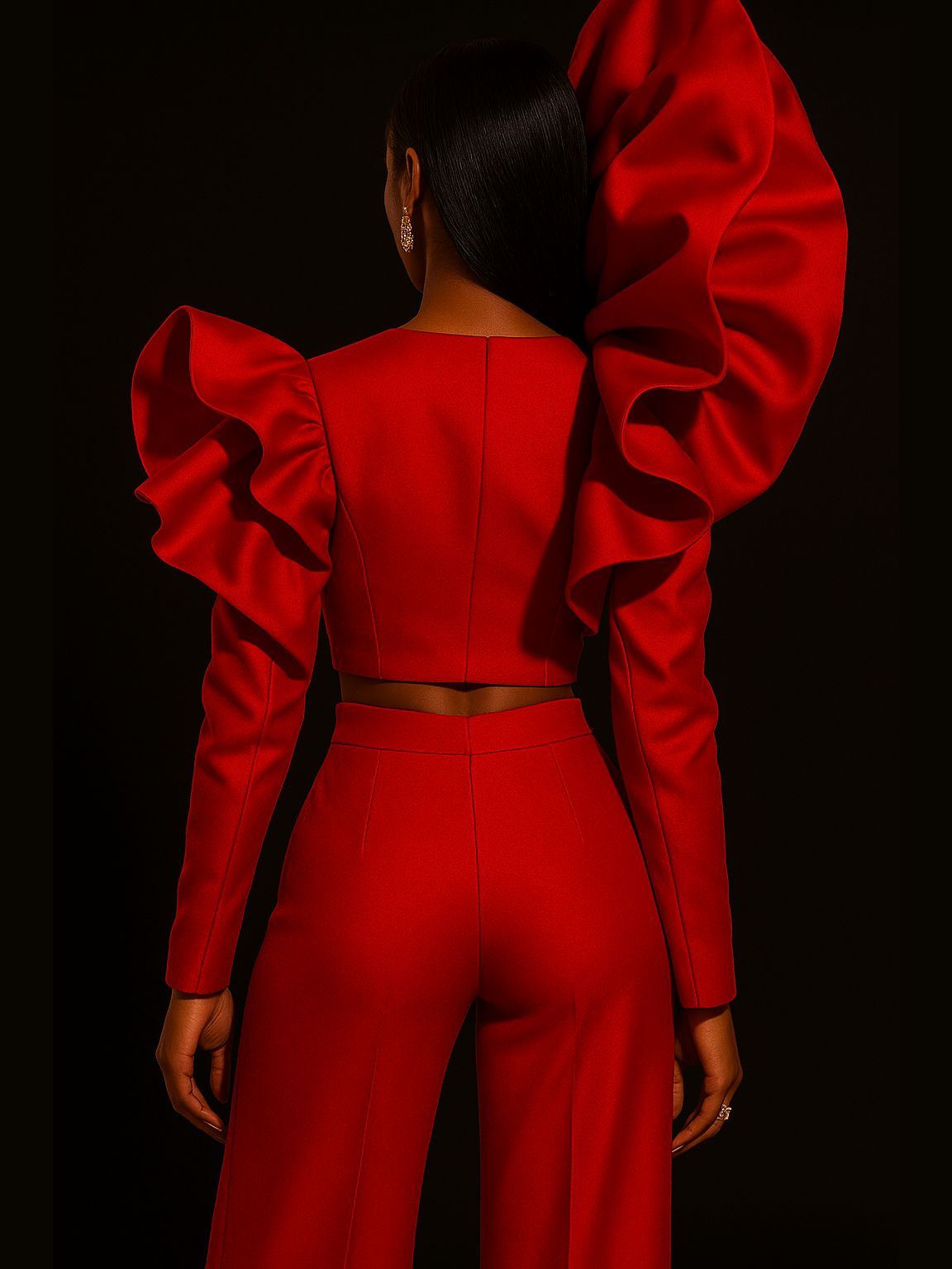 The Disrupter is made for the woman who doesn’t blend in—she shifts the atmosphere. Crafted from luxe stretch taffeta, this powerful 2-piece set features a sculpted, architectural crop jacket paired with a sleek tailored pant. Dramatic, unapologetic, and unforgettable, this look was designed to break norms, bend rules, and command every room without apology.