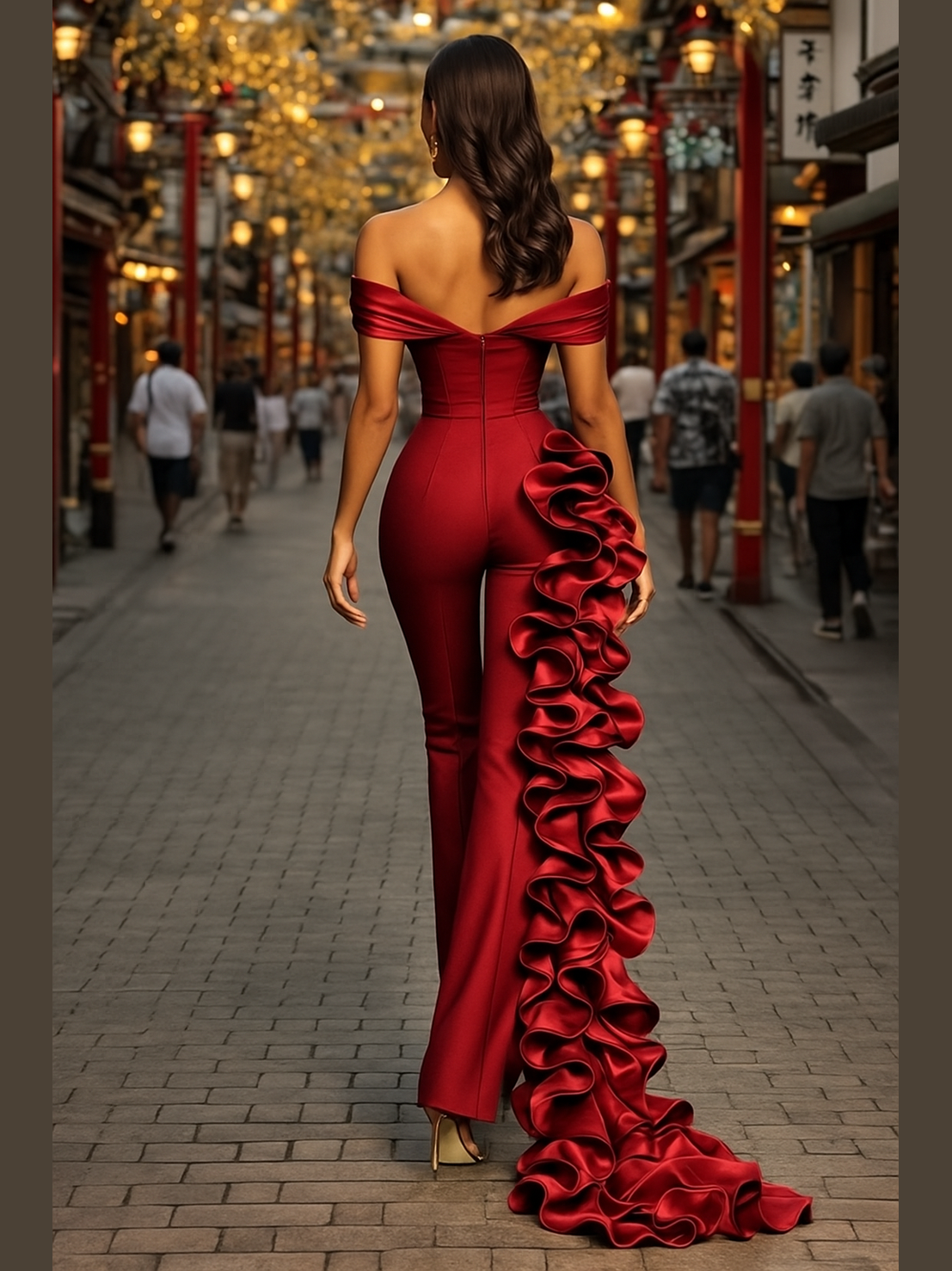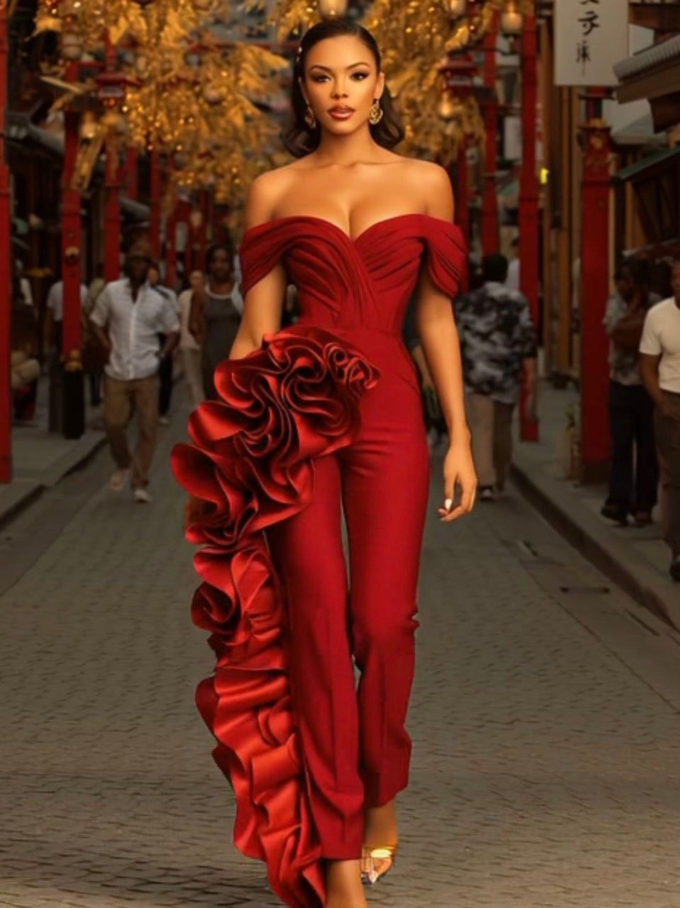 This sculpted, off-shoulder jumpsuit features a corseted bodice that carves the waist with precision, paired with an architectural cascade of hand-formed ruffles that trail down the leg like a living sculpture. The rich crimson hue radiates luxury and authority, while the tailored pant leg elongates the silhouette with effortless sophistication.