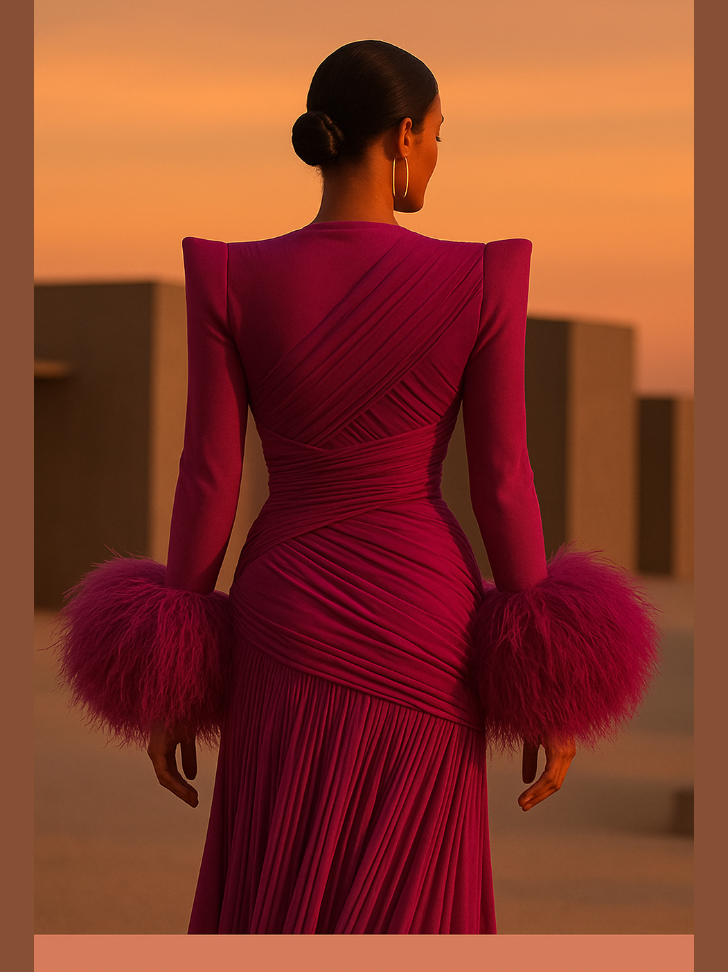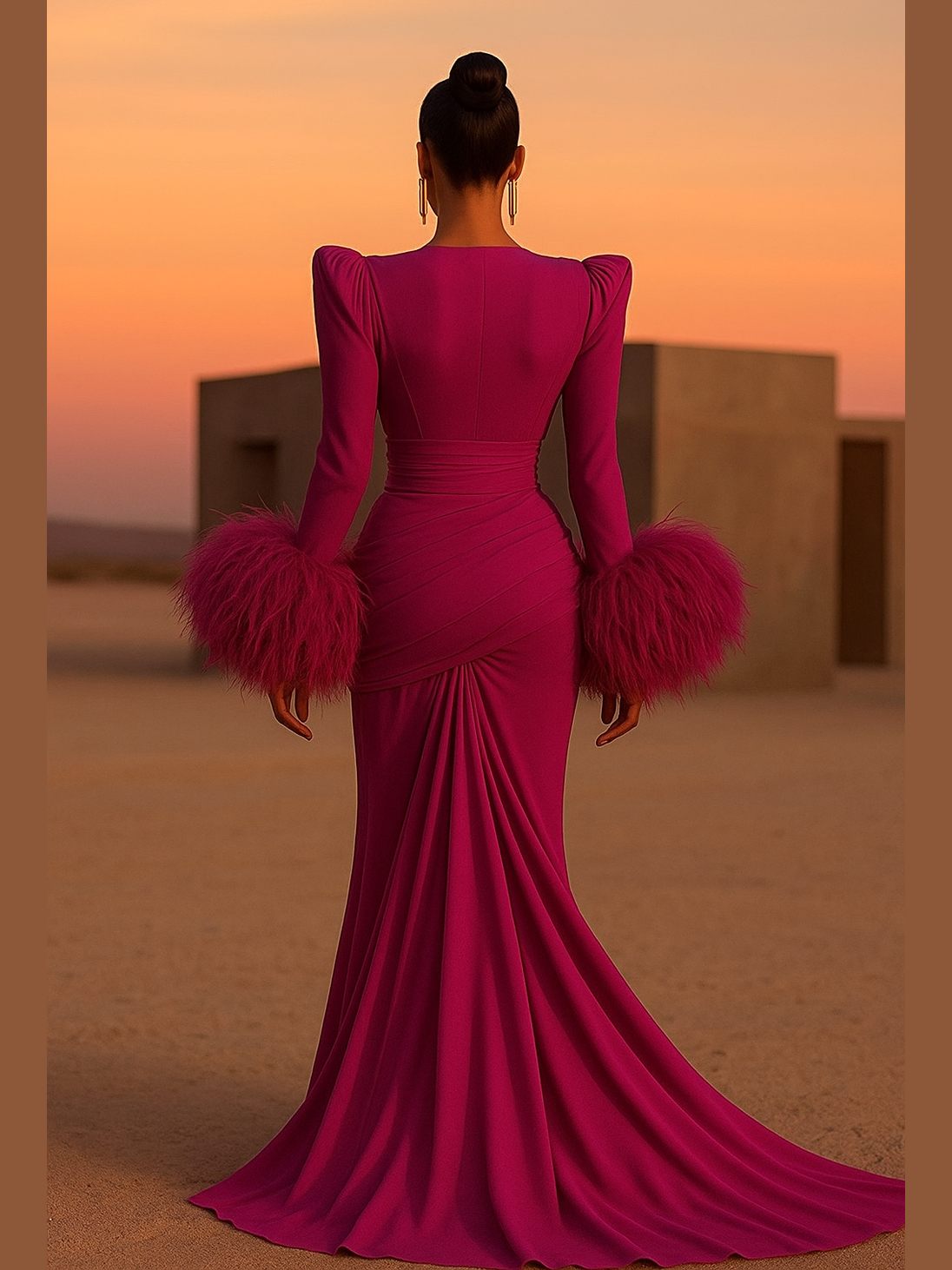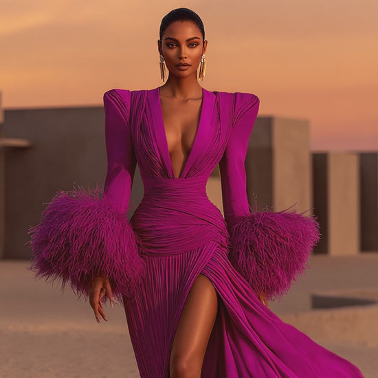 The skirt flows in dramatic pleats that glide with every step, revealing a daring thigh-high slit that adds undeniable allure. Luxurious feather cuffs bring high-fashion drama, completing a look that is destined for red carpets, luxury events, and once-in-a-lifetime entrances.