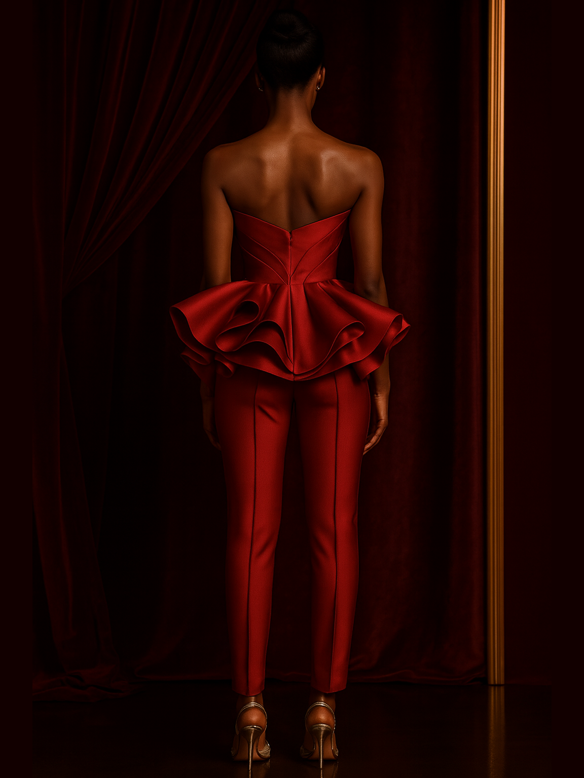 Tailored cigarette-cut pants balance the drama with a sleek, powerful finish—perfect for the woman who owns every room without ever raising her voice. This is high fashion with a wicked whisper, a statement for the one who is both the bouquet and the warning label.