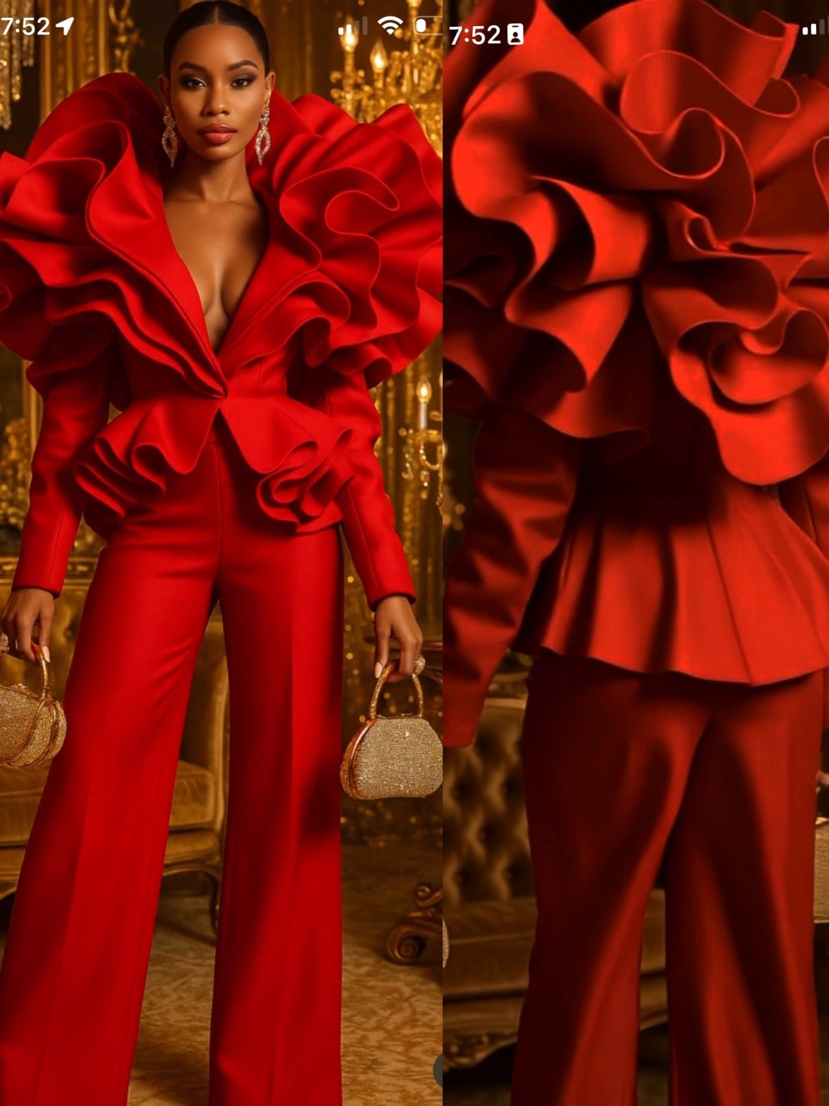 - Couture-level ruffle jacket with bold, dimensional shoulders