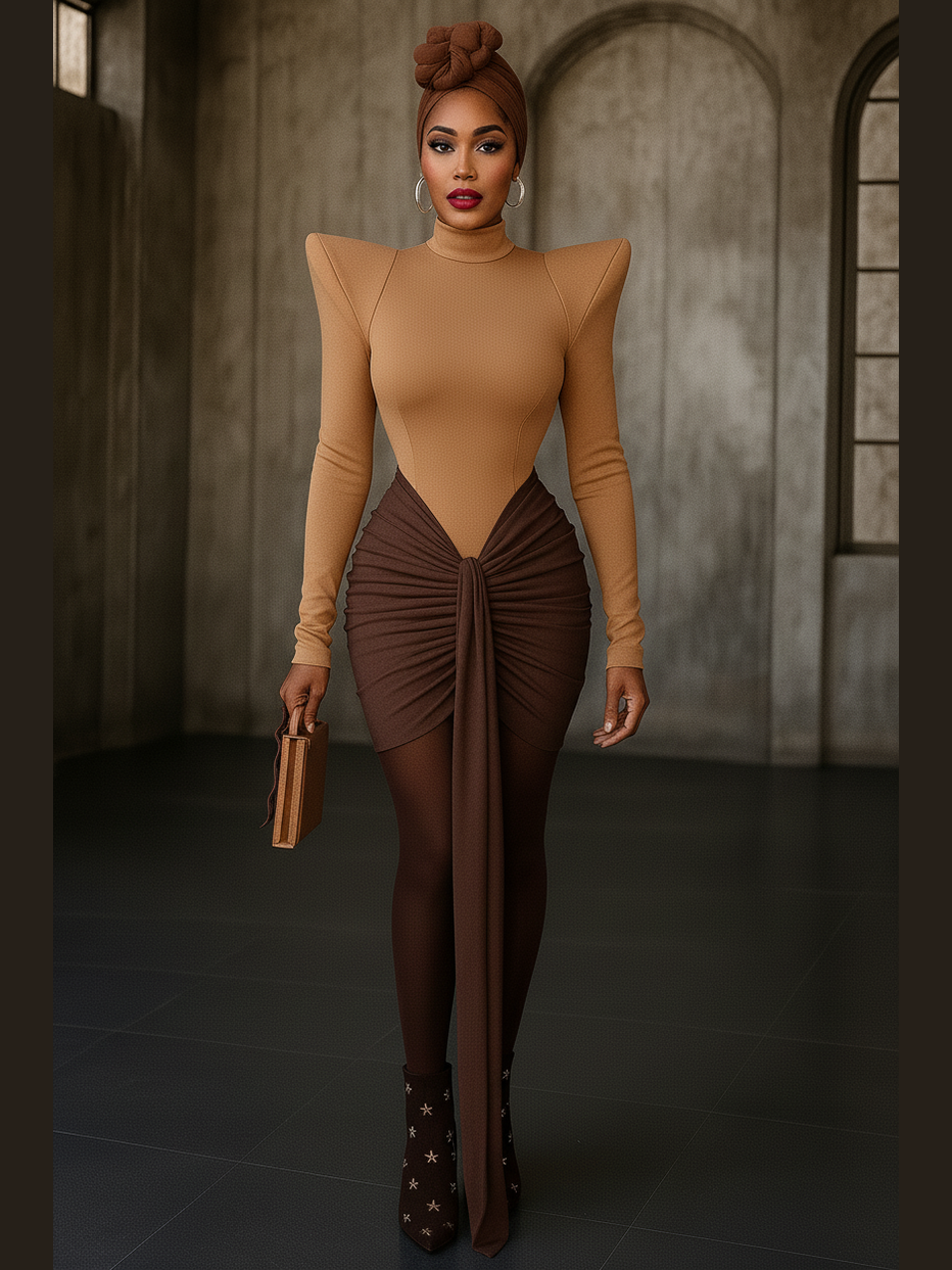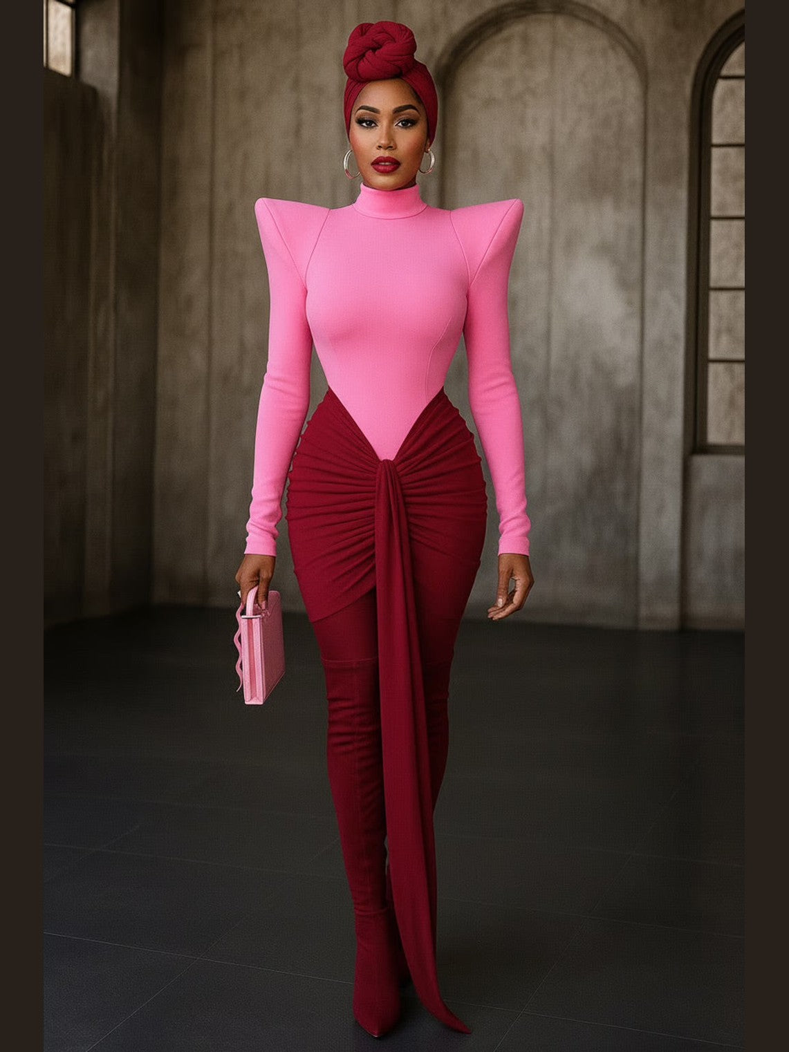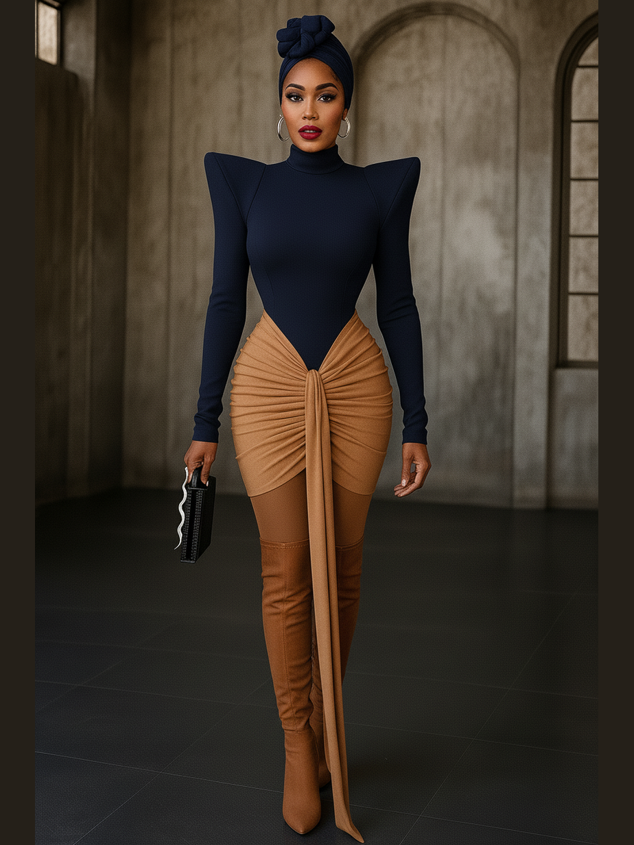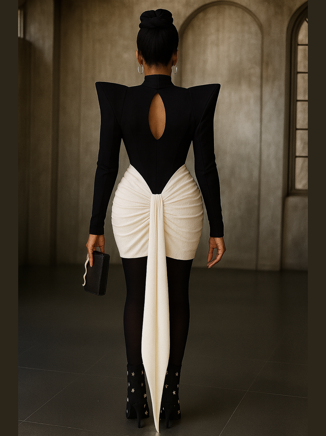The Power Stance dress is where architecture meets allure. Featuring sculpted couture shoulders that channel unapologetic strength, a sleek jet-black bodice, and a high neckline that elongates and empowers, this look was designed for the woman who doesn’t whisper when she enters the room—she commands it.