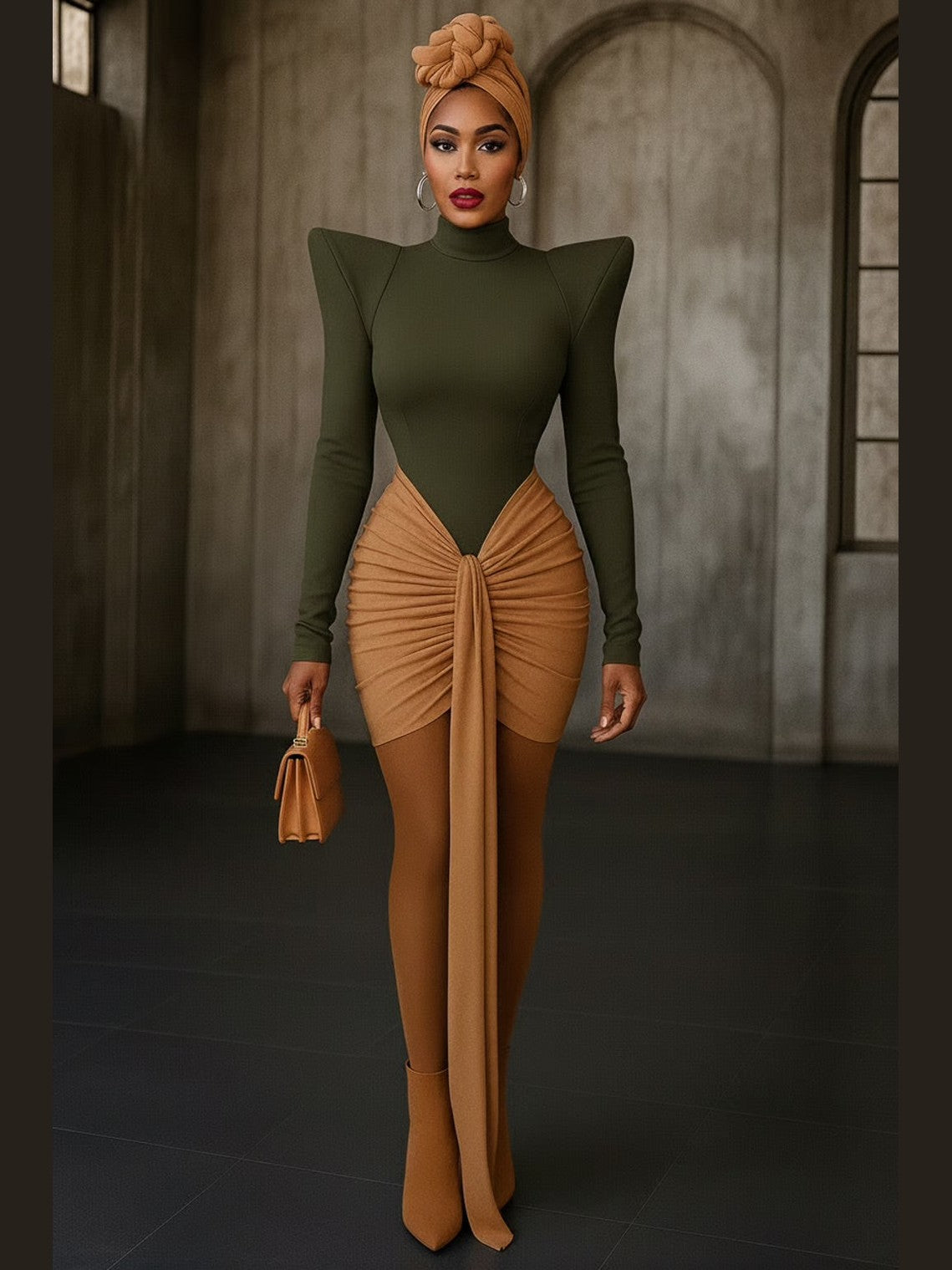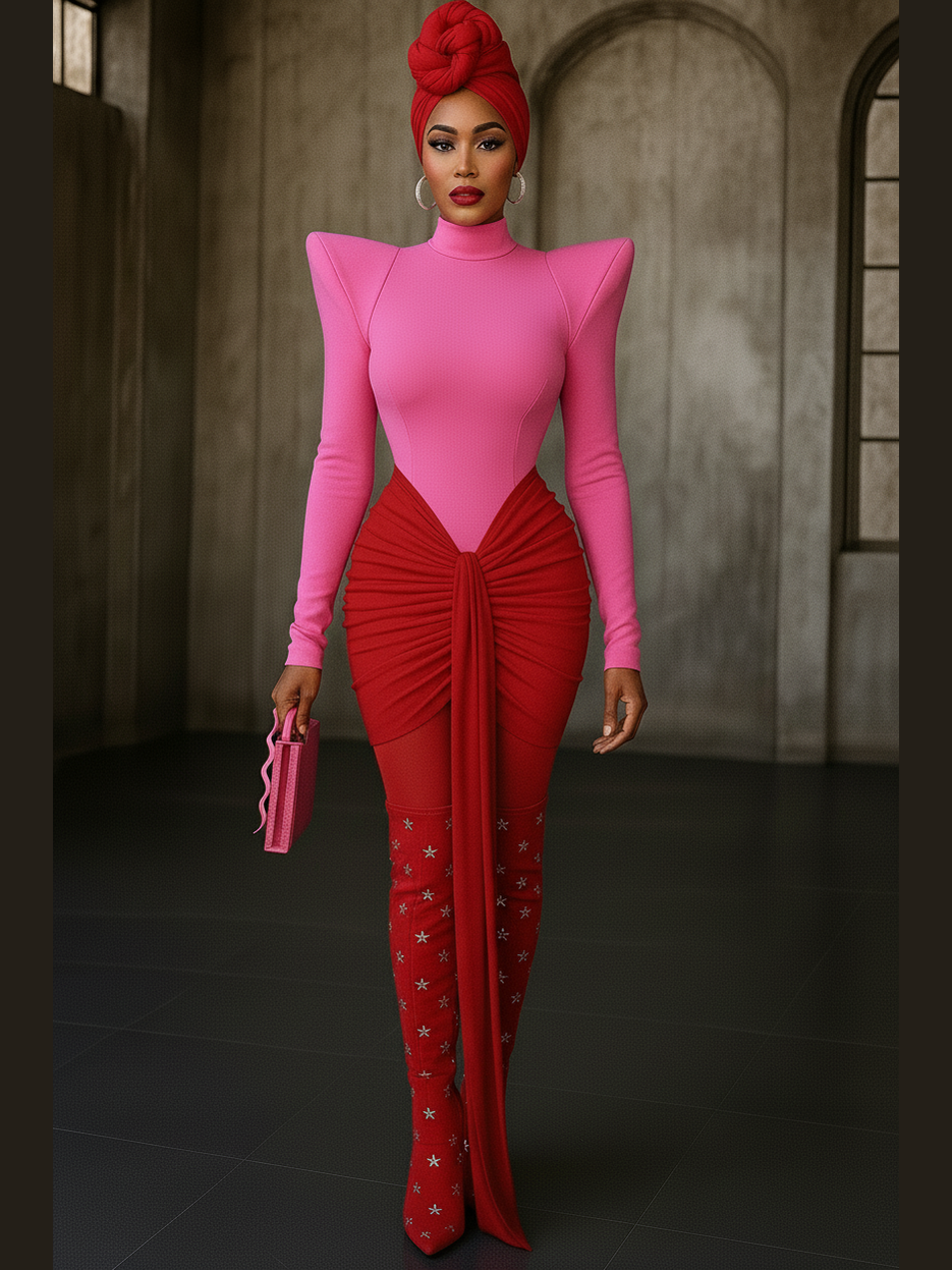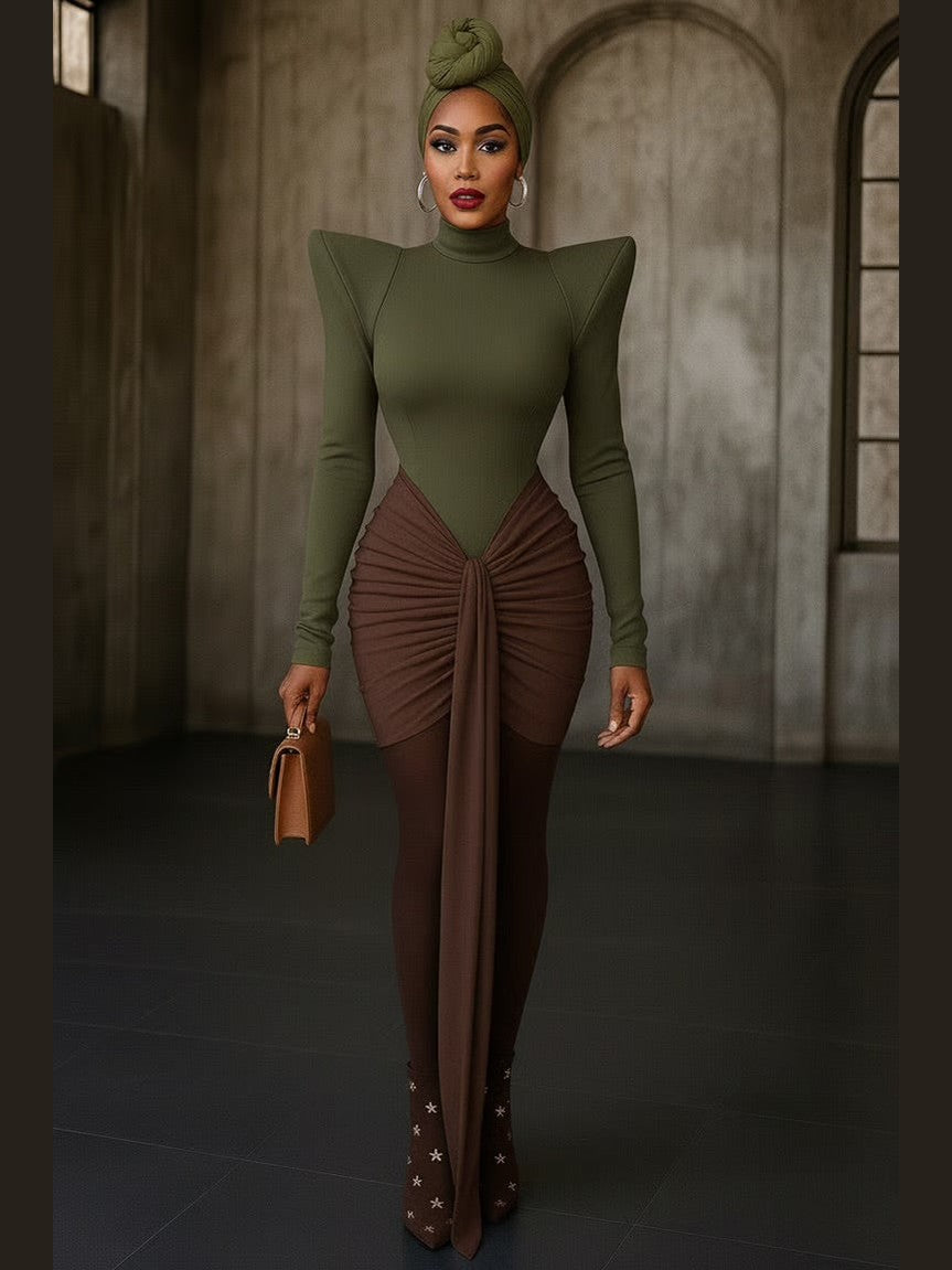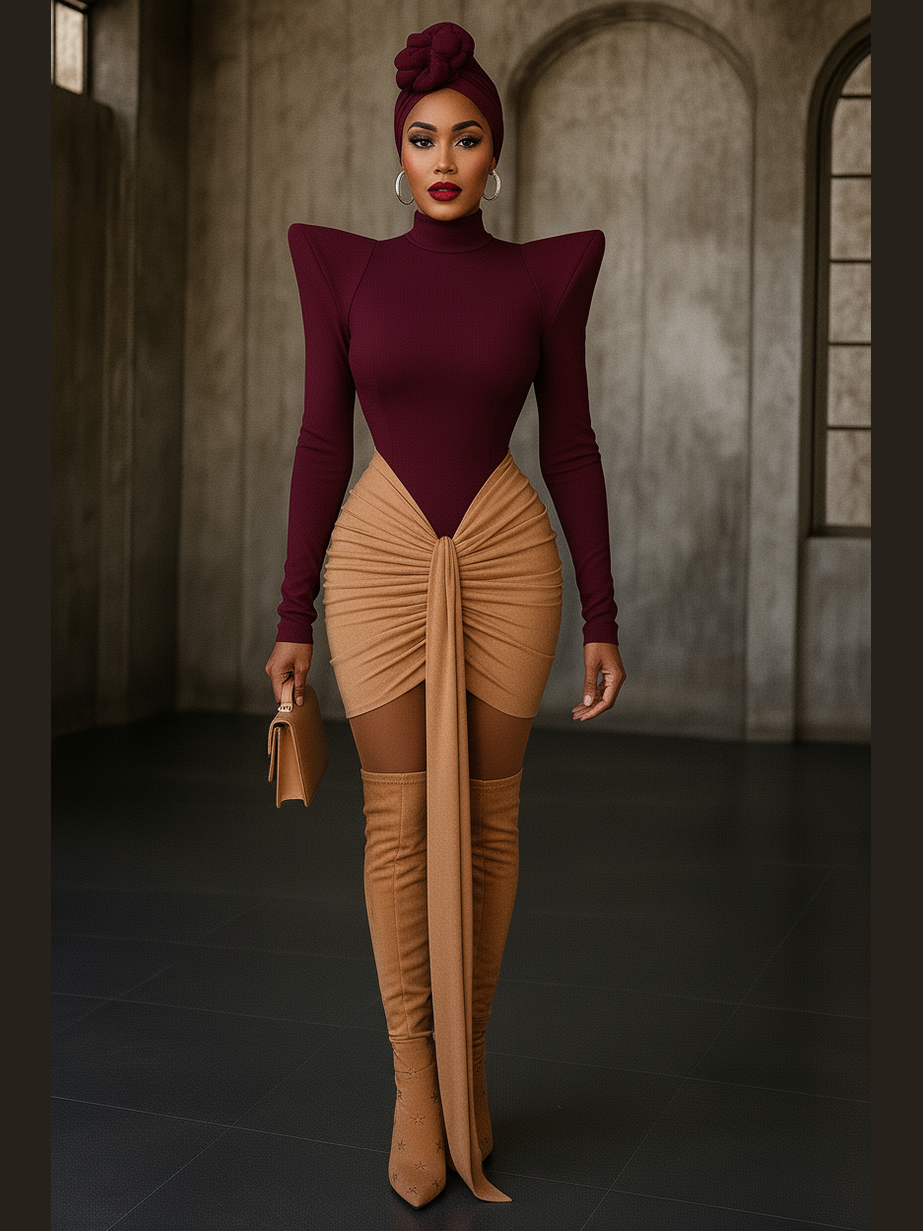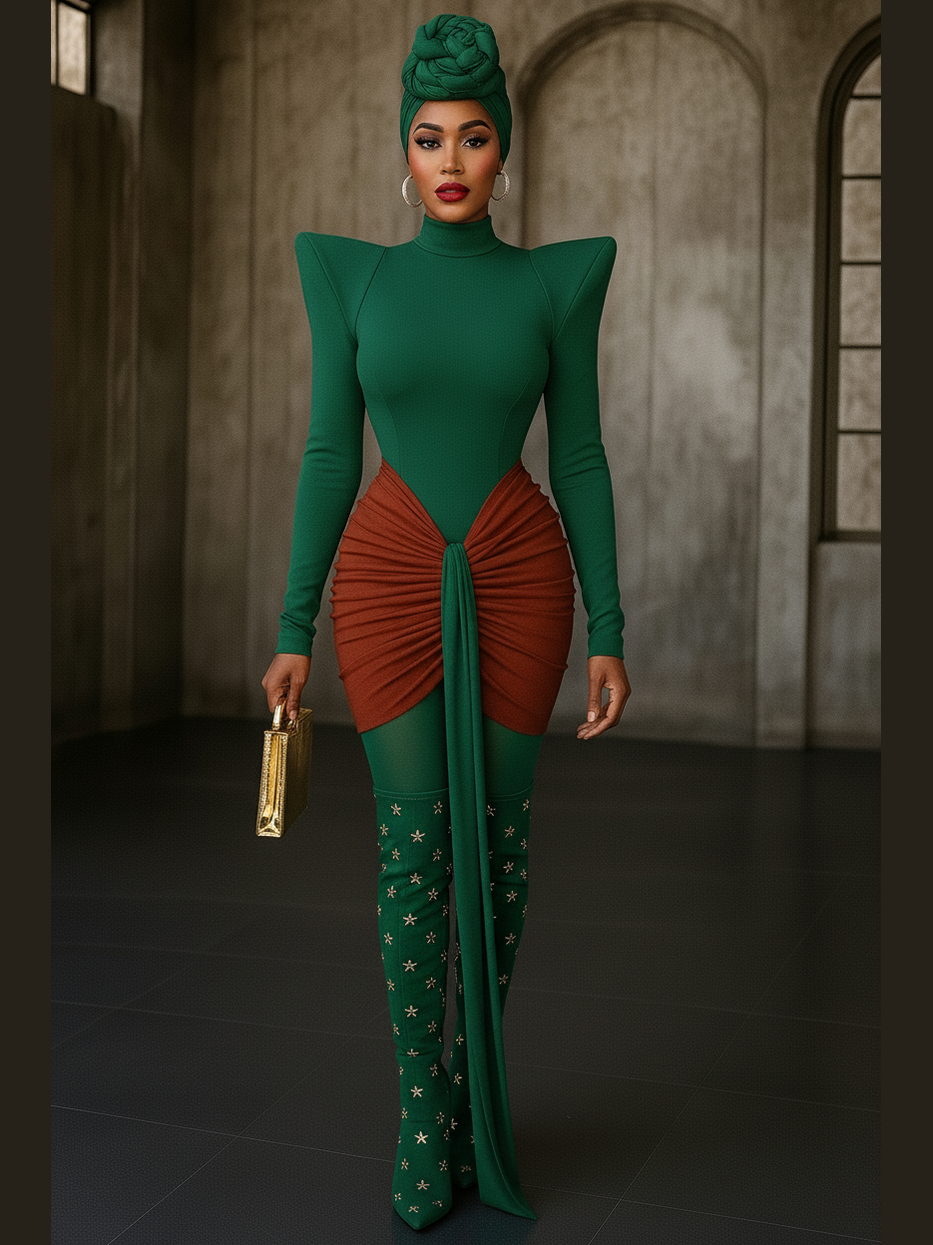 The Power Stance dress is where architecture meets allure. Featuring sculpted couture shoulders that channel unapologetic strength, a sleek jet-black bodice, and a high neckline that elongates and empowers, this look was designed for the woman who doesn’t whisper when she enters the room—she commands it.