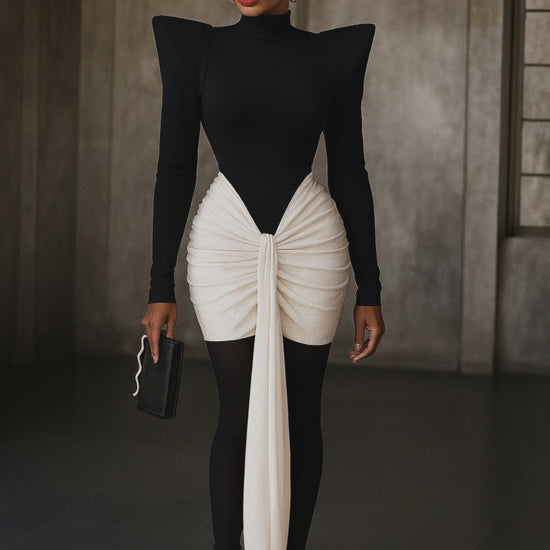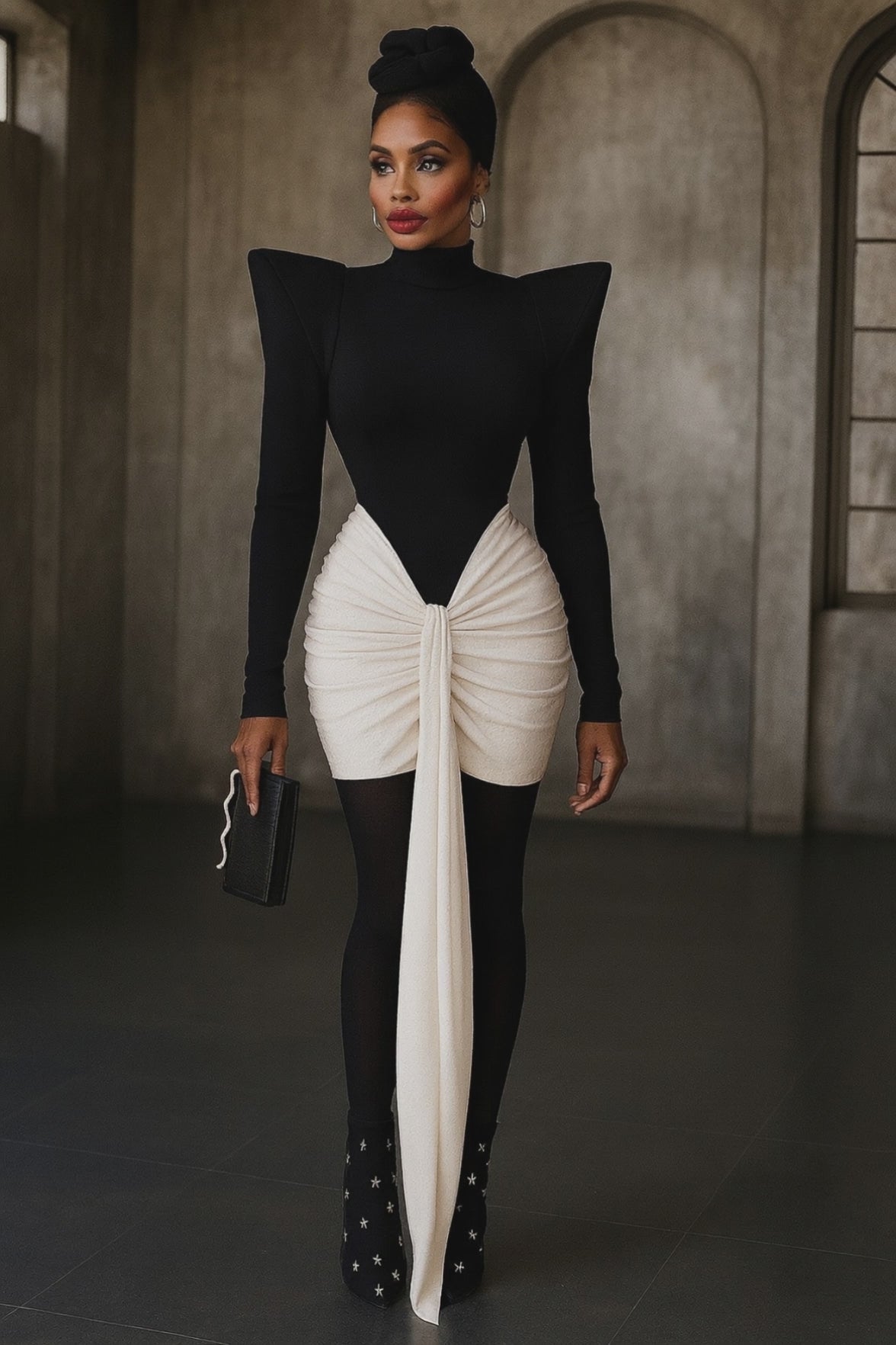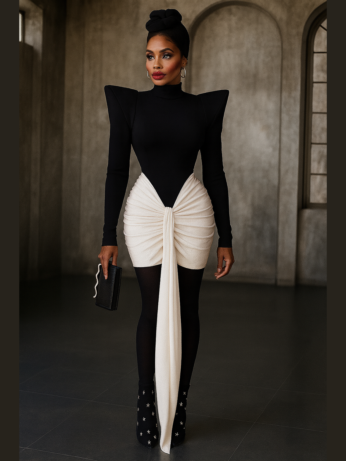The white ruched skirt gathers into a dramatic draped tie, creating a statuesque silhouette that celebrates curves with precision and poise. Luxe stretch fabrication sculpts the body while allowing movement, making it as wearable as it is jaw-dropping. Finished with meticulous detail, Power Stance is the embodiment of legacy, luxury, and modern glamour.