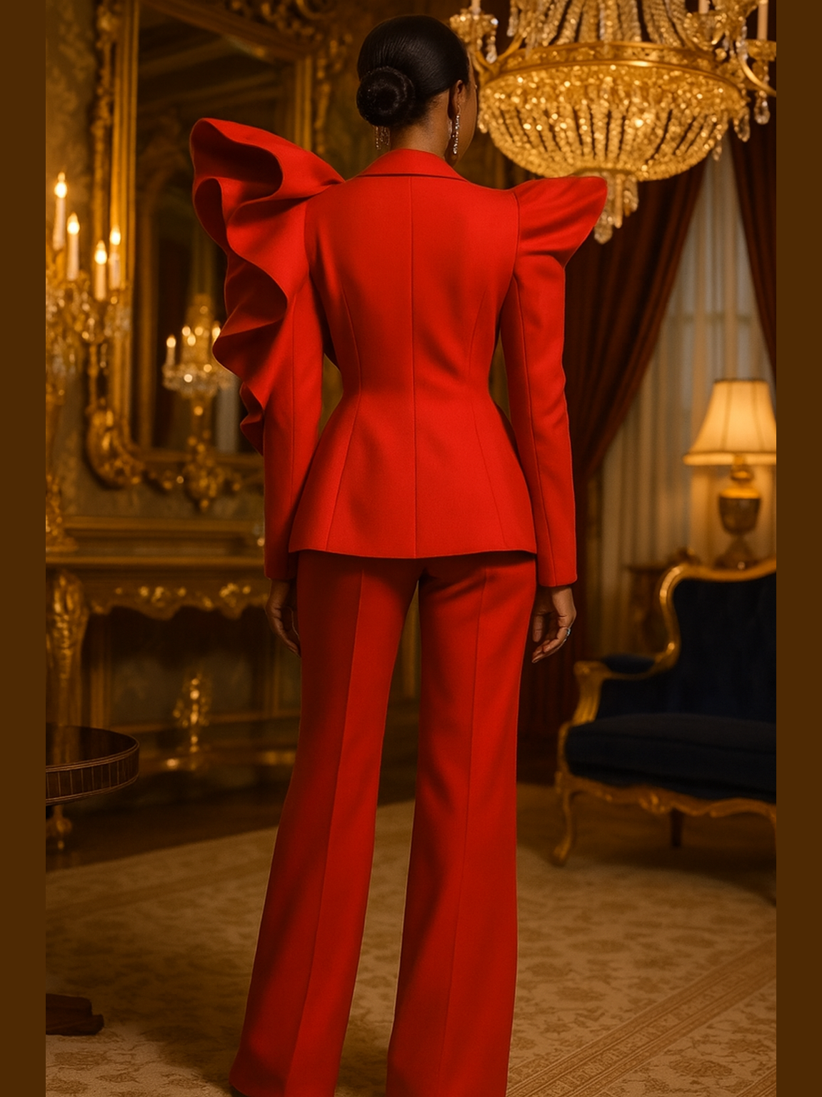 Command every room in Sculpted Bloom — a couture-level power suit for the woman who came to dominate, not decorate. This fiery red masterpiece features a dramatically sculpted, bloom-inspired shoulder that unfolds like wearable art. Precision tailoring cinches the waist, elongates the leg, and frames the body with undeniable authority.