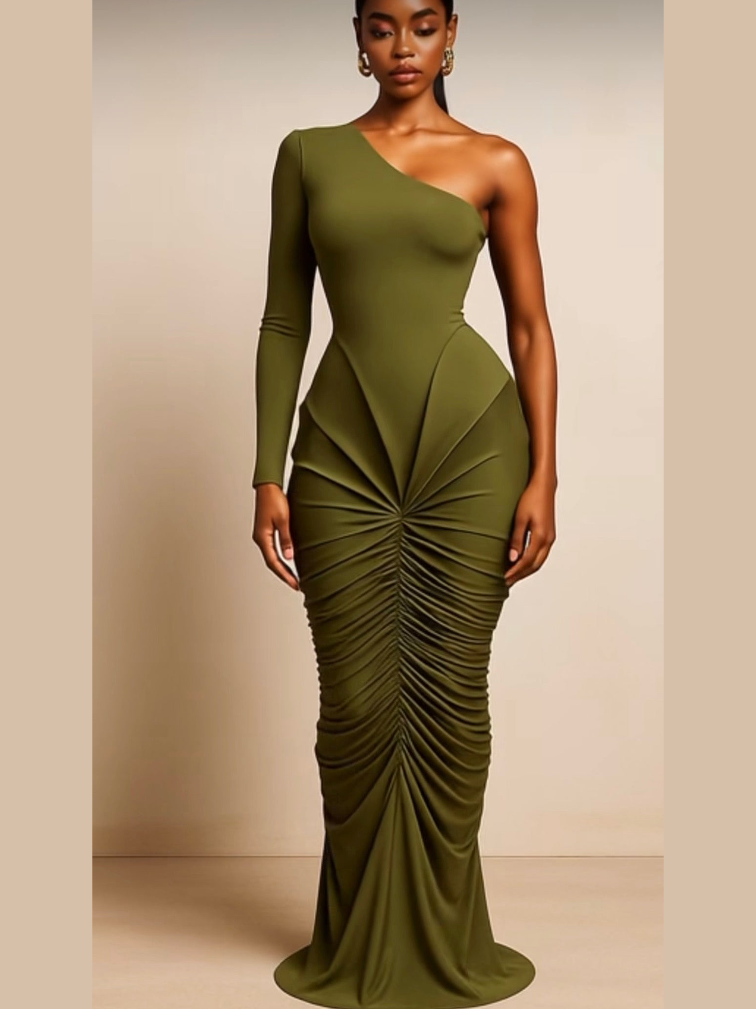 A cascading ruched column draws the eye down the body, creating a fluid, elongated shape that moves like liquid elegance. Every fold, every line, every detail is engineered to shape, snatch, and stun—transforming you into a walking work of art.