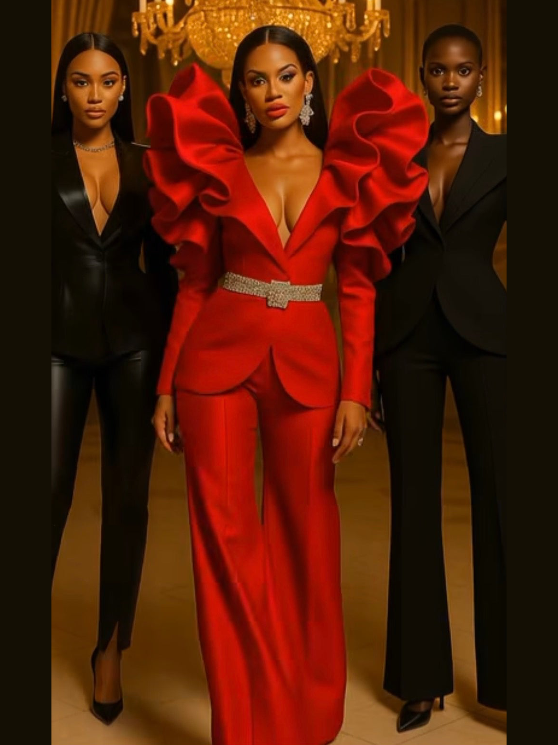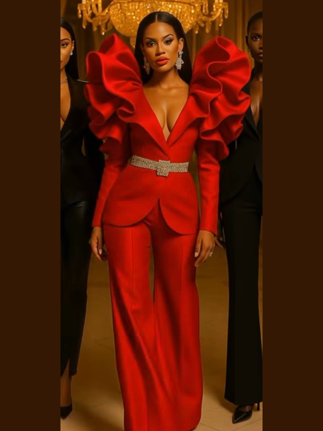 This sculptural masterpiece features exaggerated ruffled shoulders that rise like a crown, a sharply tailored cinched waist, and a dramatic wide-leg trouser that elongates the entire silhouette. Designed in a rich, statement red, this suit radiates confidence, authority, and undeniable goddess energy.