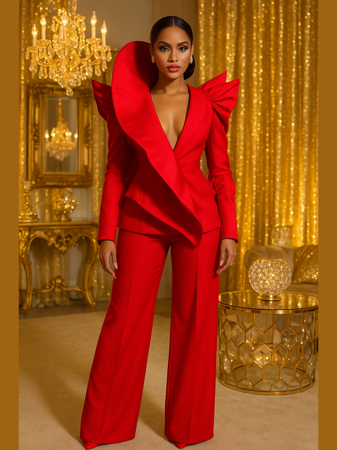 Crafted in a rich, statement red, this look features a sculpted couture shoulder and a dramatic cascading ruffle that frames the body with unapologetic confidence. Tailored to perfection, the blazer nips the waist while the wide-leg pant elongates the silhouette, giving you a clean, commanding finish from every angle.