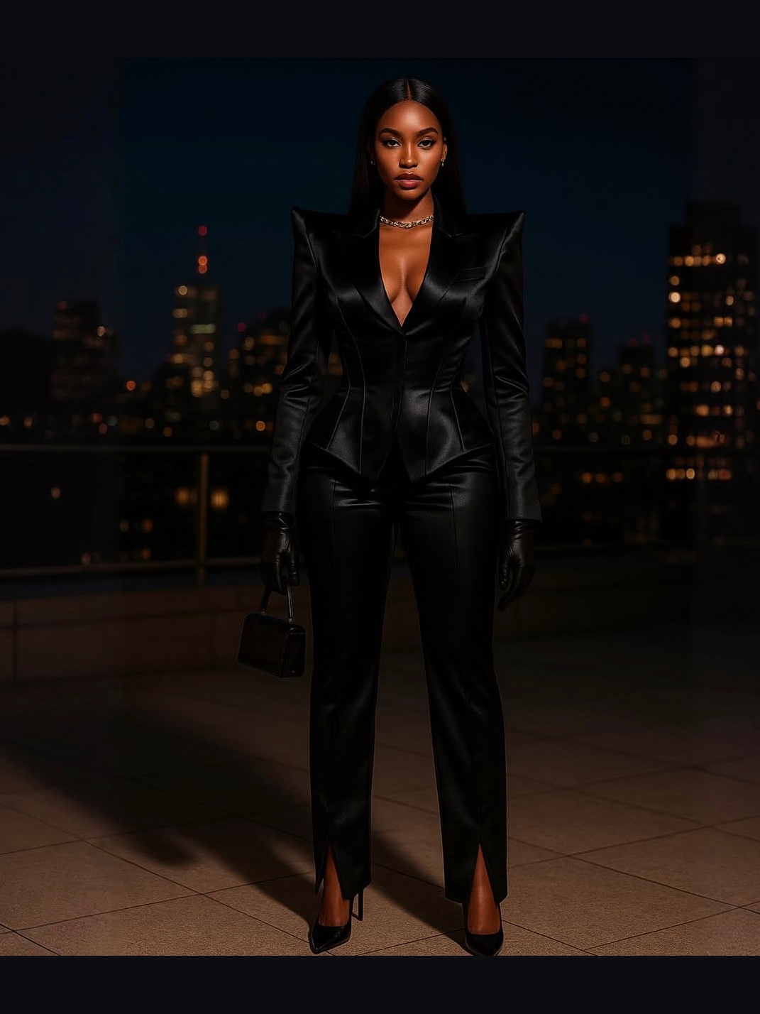 Command the night in this sleek, sculpted stretch satin power suit—crafted for the woman who leads with confidence and undeniable presence. The glossy satin finish, sharp tailoring, and cinched waist create a silhouette that is equal parts elegance and danger. Designed to move like silk but structure like armor, this suit is the definition of modern luxury.