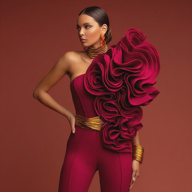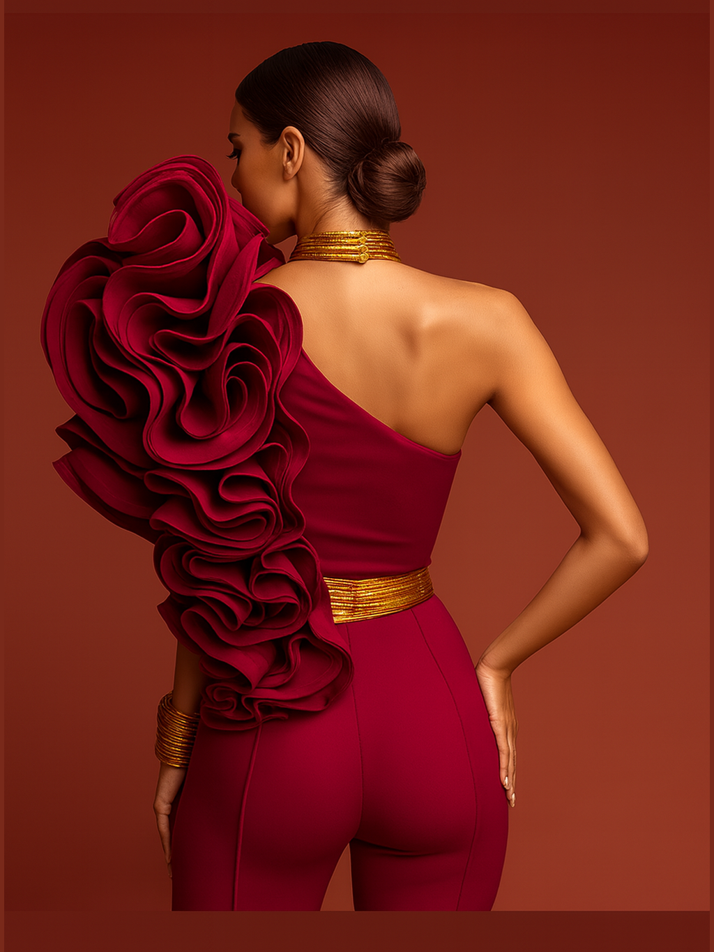 Command the room in The Grand Gesture — a sculptural masterpiece designed for those who live boldly and love louder. This one-shoulder jumpsuit features an exaggerated cascade of hand-formed ruffles that bloom like couture petals down the bodice, creating a show-stopping silhouette from every angle. Cinched at the waist with a metallic accent band and tailored to contour your curves, this look exudes high-drama elegance.