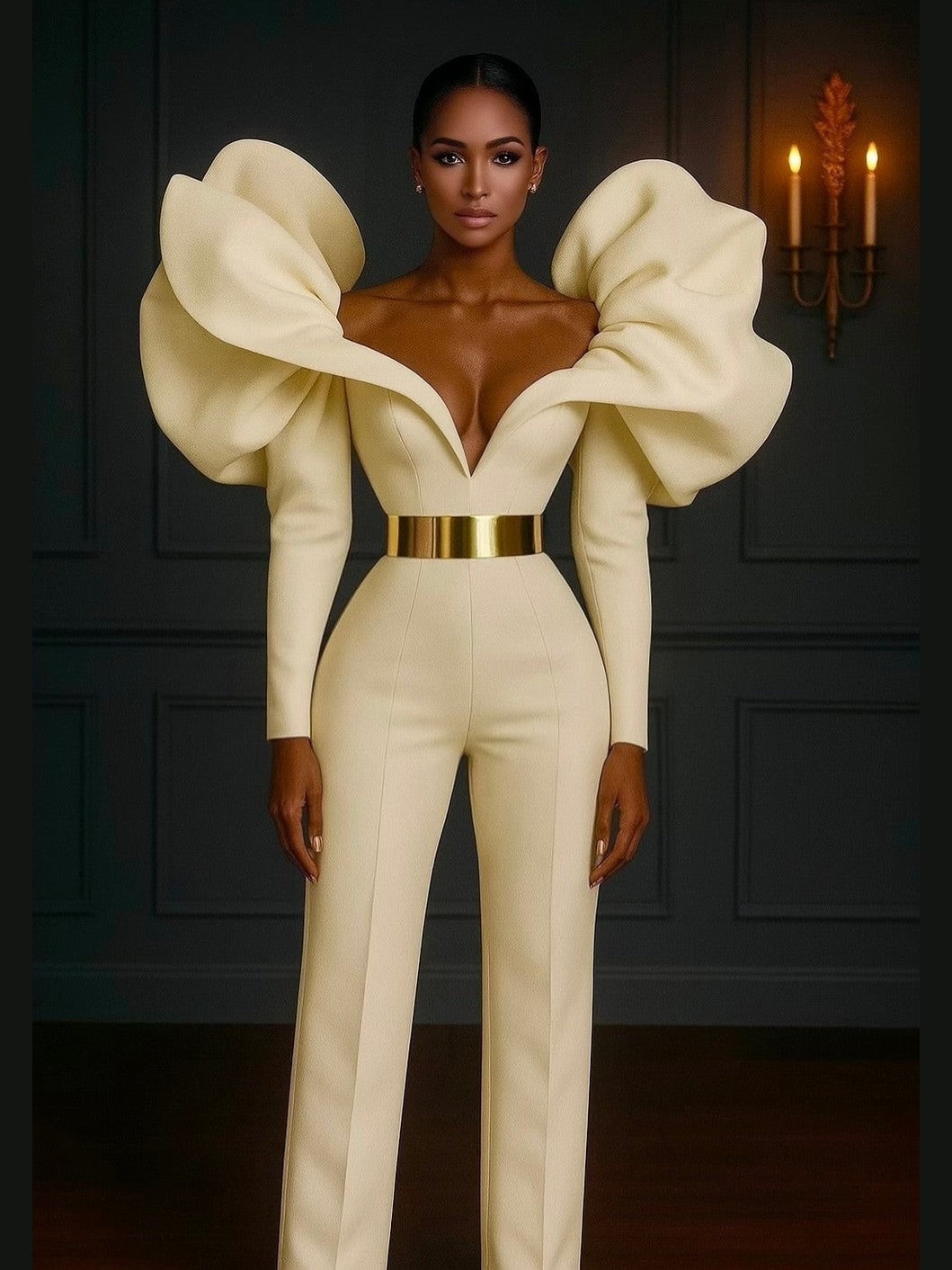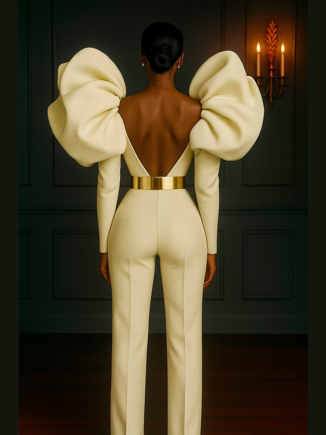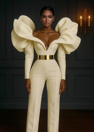 The Upper Hand is a sculptural ivory jumpsuit designed for the woman who commands attention and doesn’t ask for permission. Featuring exaggerated couture shoulder petals that bloom with power, a deep plunging neckline, and a precision-tailored silhouette that snatches the waist and elongates the frame. The look is cinched with a bold 4-inch wide gold metal belt—because control should always come with polish.